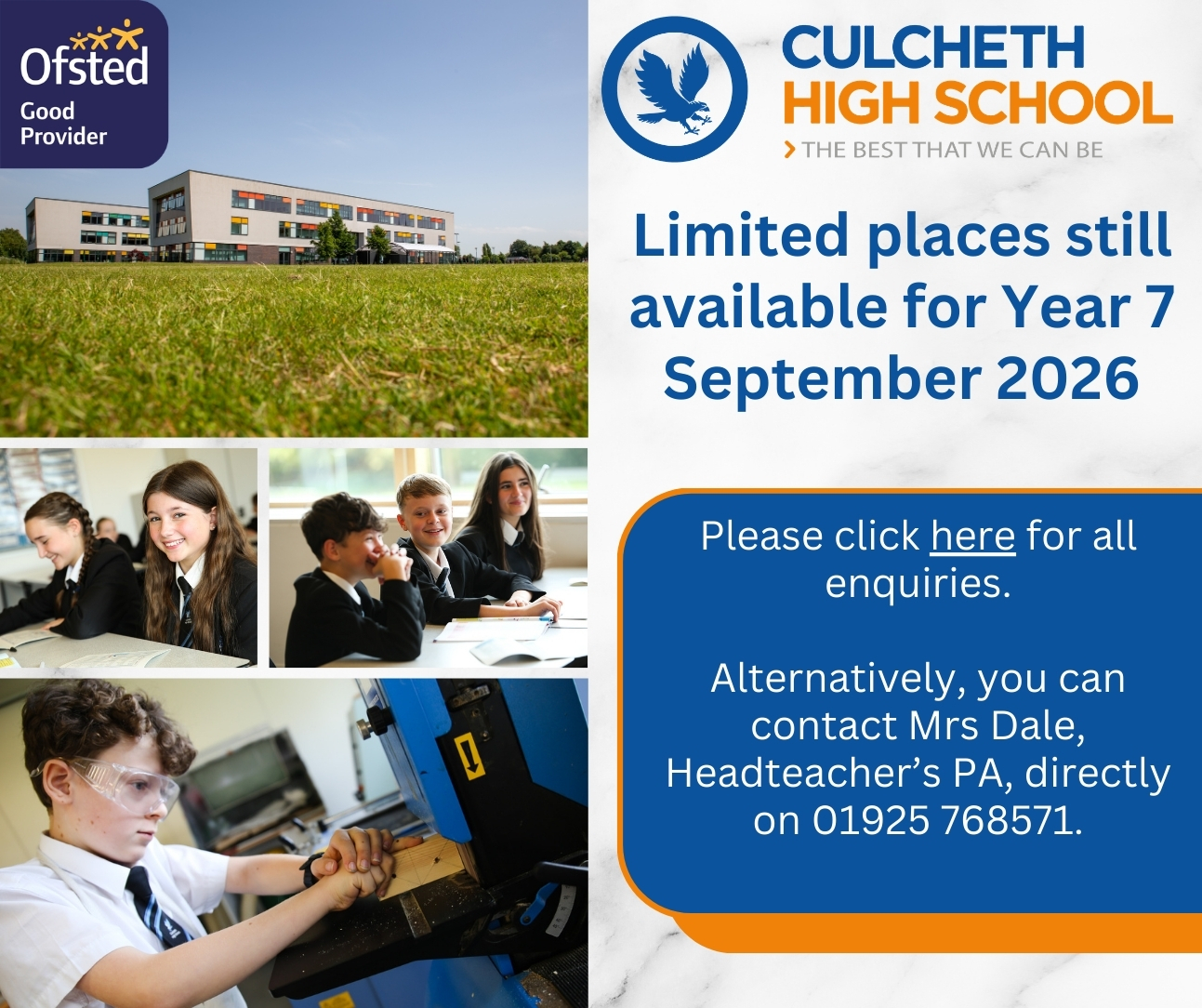Culcheth High School is a highly successful and over-subscribed community school in the heart of semi-rural Warrington. We are recognised as “a good school” by OFSTED with many outstanding features. As a high performing school over a number of years, we genuinely strive to become the 'best that we can be' in all aspects of our work for young people and the community.